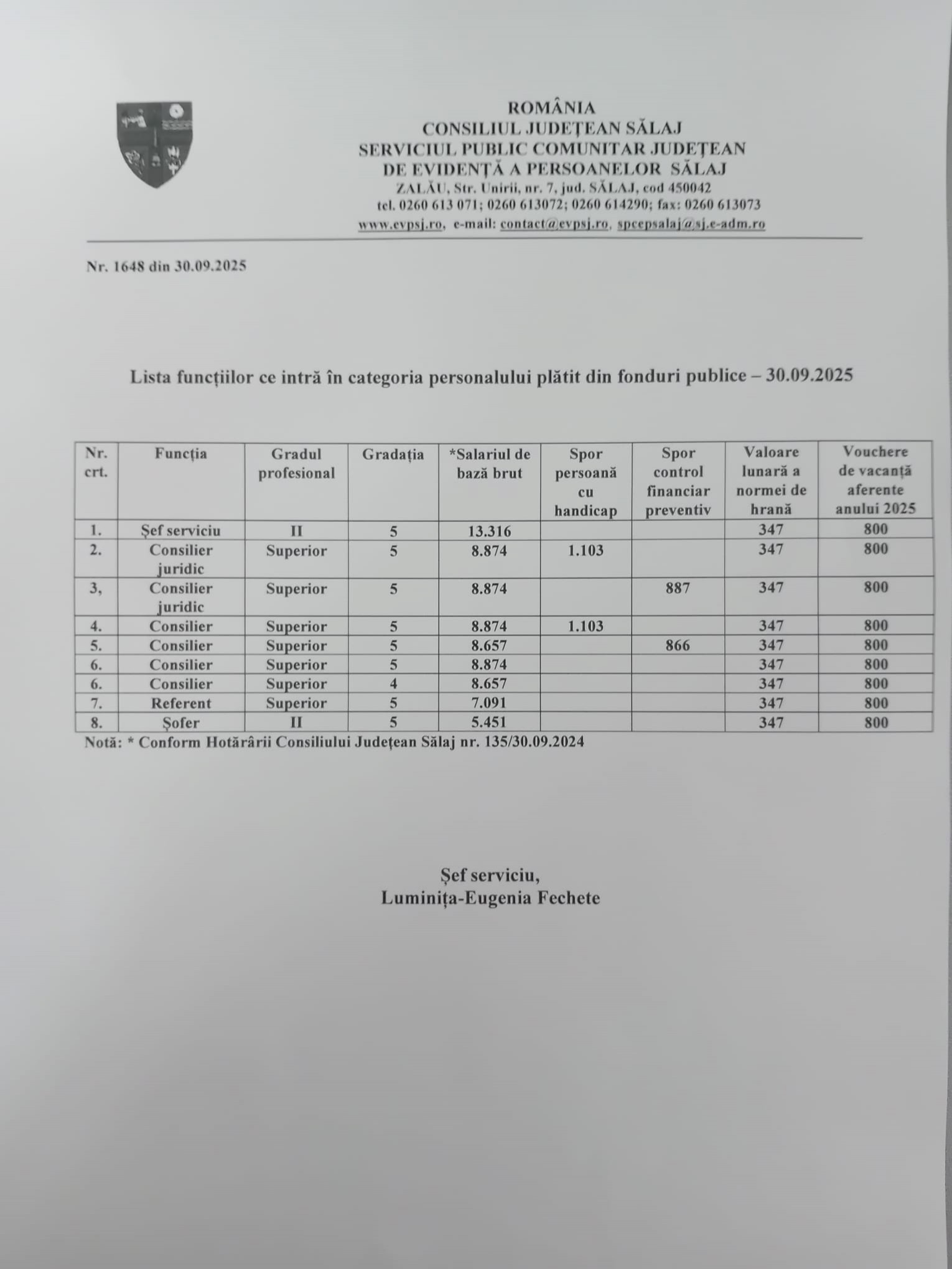 Lista funcţiilor ce intră în categoria personalului plătit din fonduri publice - 30.09.2025